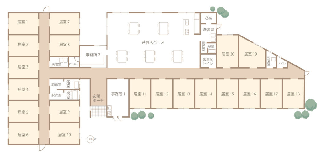 居室はすべて個室です。落ち着いたプライベート空間にてゆっくりとお過ごしいただけるよう、快適さと安全性を追求しました。使い慣れた家具やテレビ等をお持ち込みいただけます。